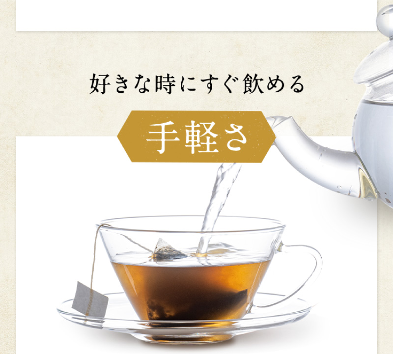 <お湯出し>ティーバッグ1個をポットに入れ、沸騰したお湯を600mL注ぎ、3分程おきティーバッグを10回程度上下に振ったあと取り出してから全量をお召し上がりください。