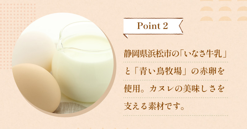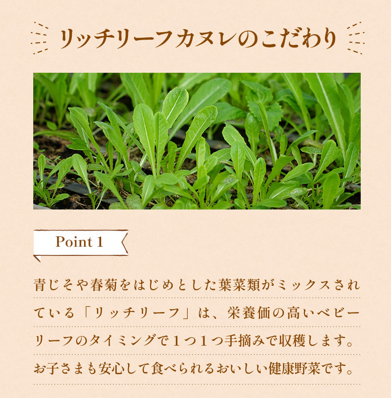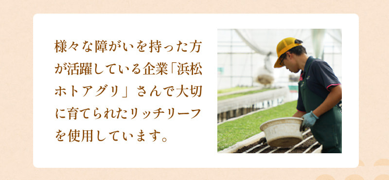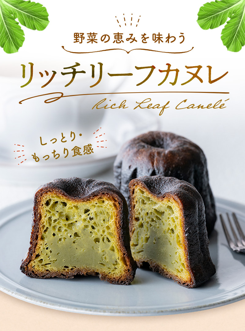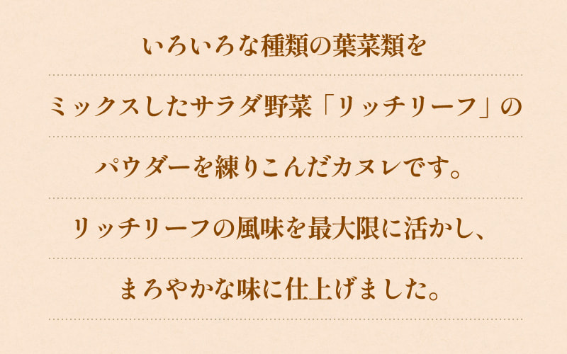 - 牛乳(静岡県産)、砂糖、卵(静岡県産)、小麦粉、リッチリーフパウダー®(ベビーリーフ)(静岡県産)、バター、洋酒