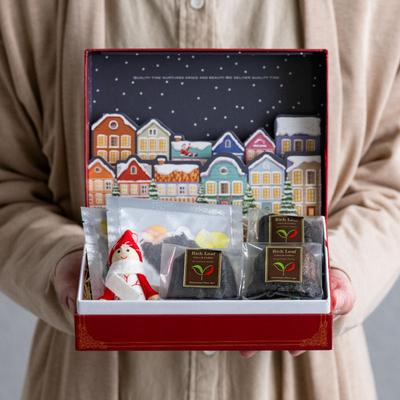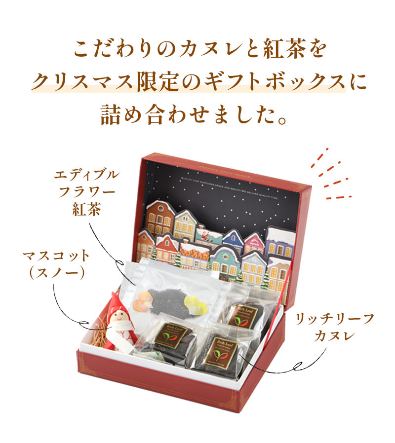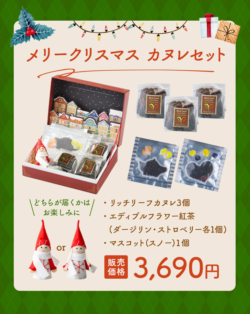 - リッチリーフカヌレ45g×3個、エディブルフラワー紅茶2g×2個(ダージリン、ストロベリー×各1個)、マスコット(スノー)×1個