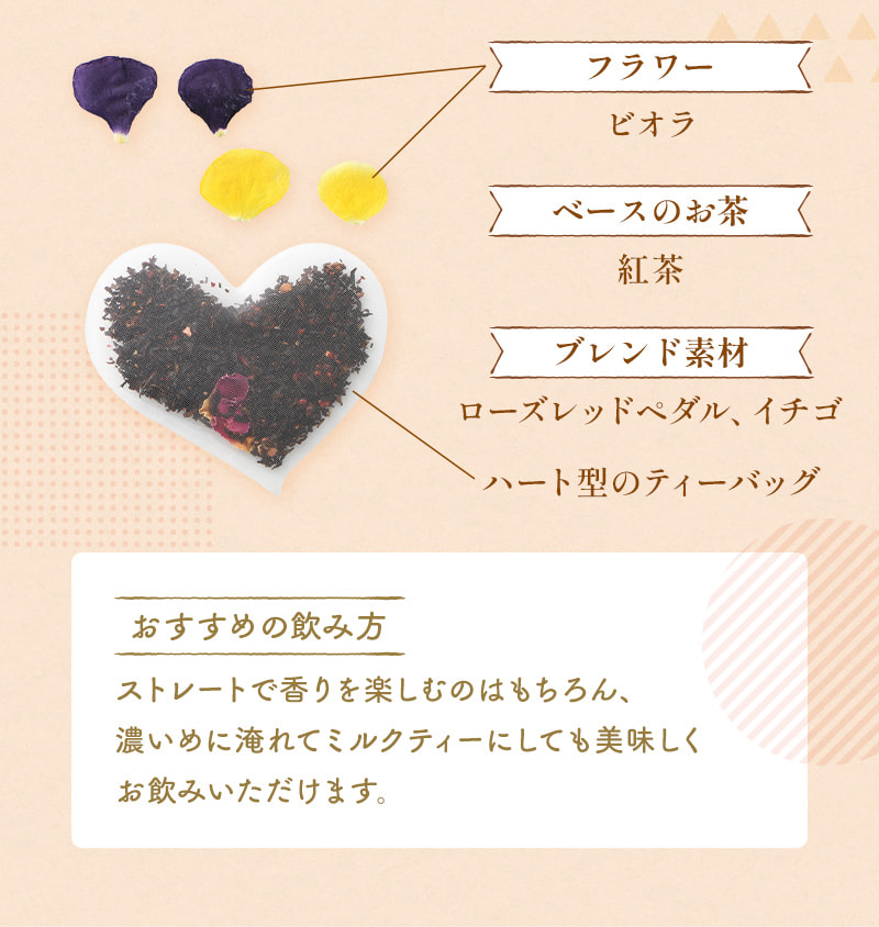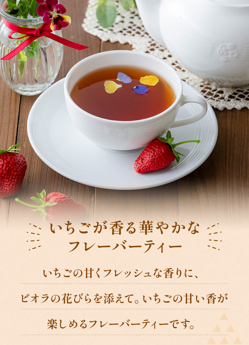 - 紅茶(インド)、いちご、ローズレッドペタル、食用花(ビオラ)/香料