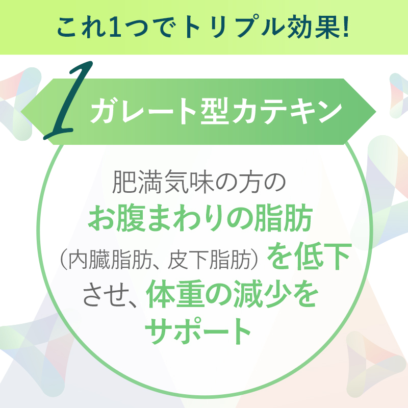 ガレート型カテキンには、肥満気味の方のお腹まわりの脂肪(内臓脂肪、皮下脂肪)を低下させ、体重の減少をサポートし、高めのBMIを低下させる機能があることが報告されています。