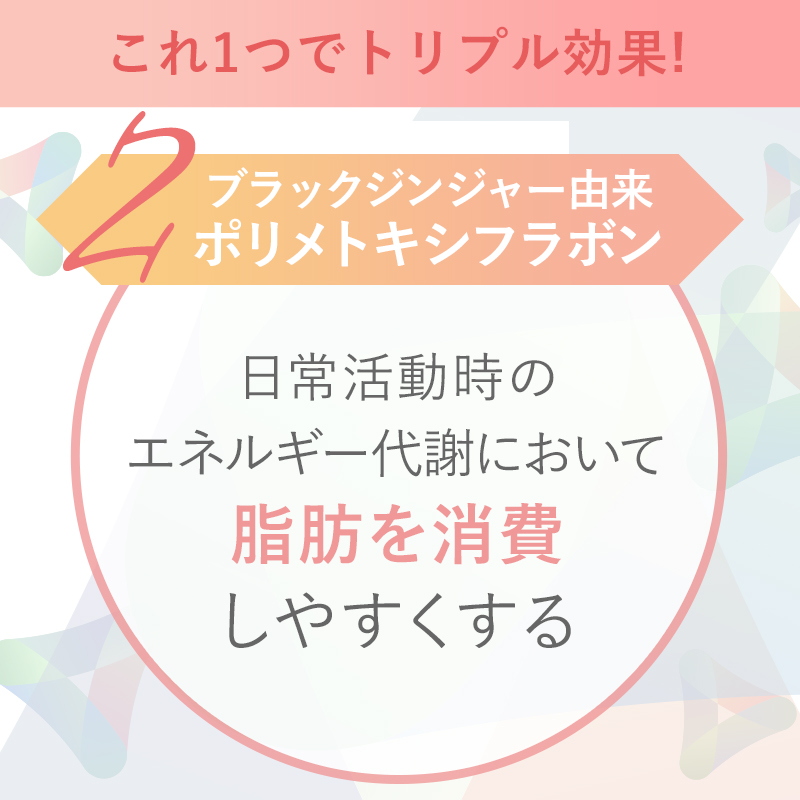 ブラックジンジャー由来ポリメトキシフラボンには、日常活動時のエネルギー代謝において、脂肪を消費しやすくする機能があることが報告されています。
