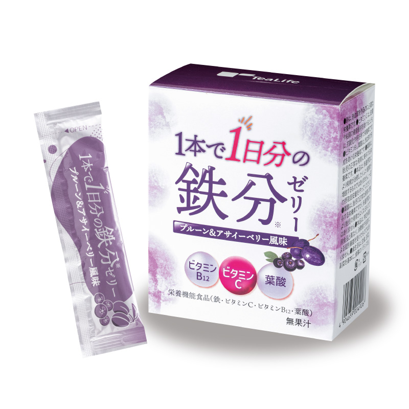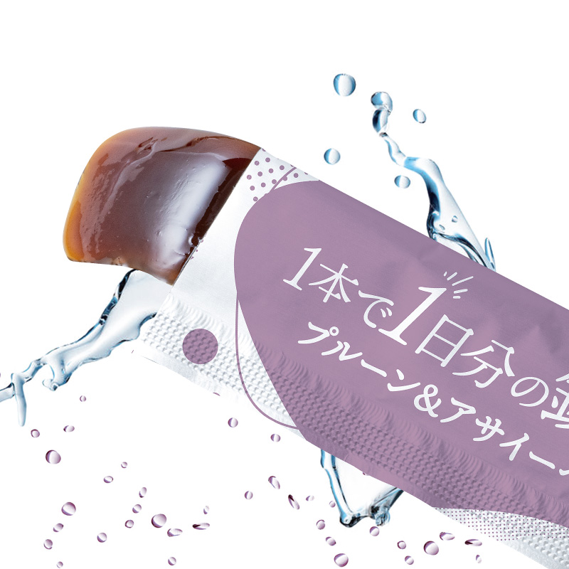 - プルーンエキス(アメリカ製造)、アサイーエキス末、葉酸含有酵母/香料、ゲル化剤(増粘多糖類)、ビタミンC、pH調整剤、カラメル色素、ピロリン酸鉄、甘味料(ステビア)、ビタミンB12