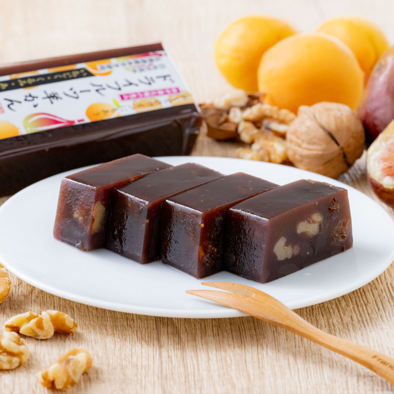 - 砂糖(国内製造)、小豆、ドライイチジク(イチジク、米粉)、還元水飴、くるみ、水飴、あんず、寒天