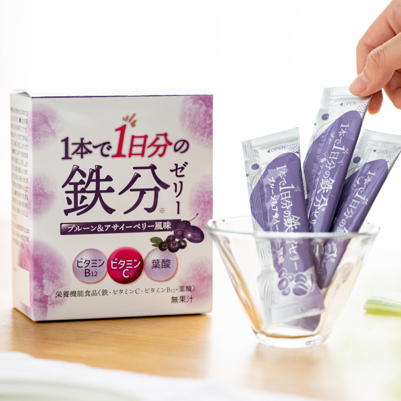 1日分の鉄分がゼリーで補給できるなんて!美味しいから続けられる! 鉄分が気になるあなたへ。1本で1日分の鉄分ゼリー ダイエットなどで偏った食事を続けていると、鉄分が不足しがちに。 1本で1日分の鉄分ゼリーは、1日分の鉄分を1本で美味しく補給!さらに嬉しい成分がこんなに!ビタミンB12・ビタミンC・葉酸 スーパーフード「アサイー」 ベリー風味の甘酸っぱさが美味しいスティックタイプのゼリー。 栄養機能食品 1本で1日分の鉄分ゼリー お申込みはこちら 鉄は、赤血球を作るのに必要な栄養素です。 ビタミンCは、皮膚や粘膜の健康維持を助けるとともに、抗酸化作用を持つ栄養素です。ビタミンB12、葉酸は、赤血球の形成を助ける栄養素です。葉酸は、胎児の正常な発育に寄与する栄養素です。