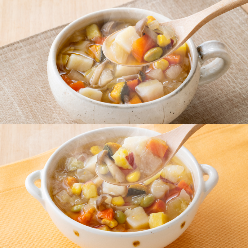 | 全原材料 | 野菜(国産)[じゃがいも、人参、玉ねぎ、大根、コーン、さつまいも、キャベツ、しめじ、かぼちゃ、むき枝豆]、野葉ブイヨン、食塩 |