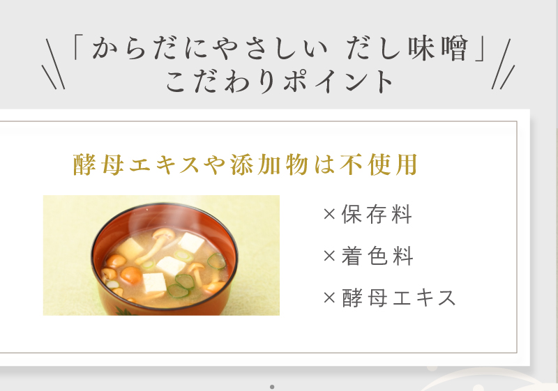 - 米みそ(大豆、米、塩)(国内製造)、鰹の節、鰯煮干、昆布、乾椎茸