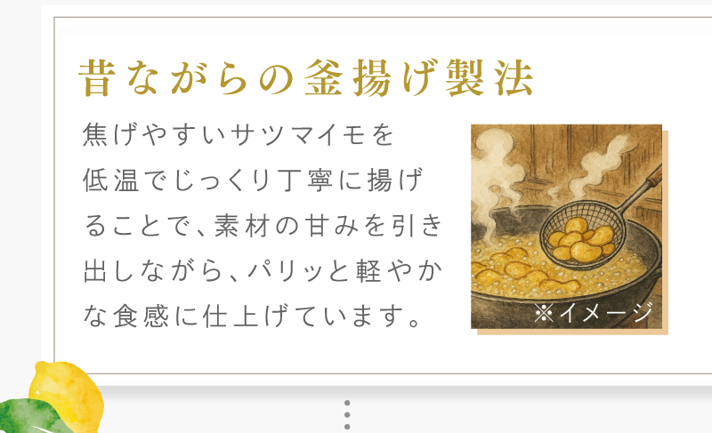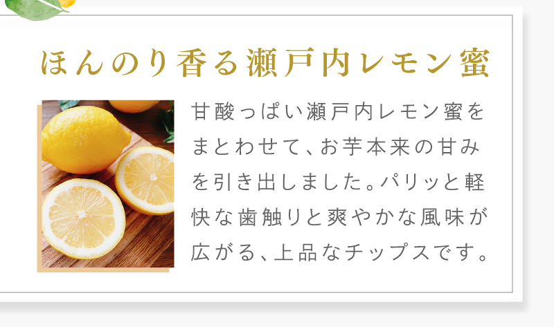 - さつまいも(国産)、植物油、砂糖、食塩、レモン果皮加工品(レモン(瀬戸内産))