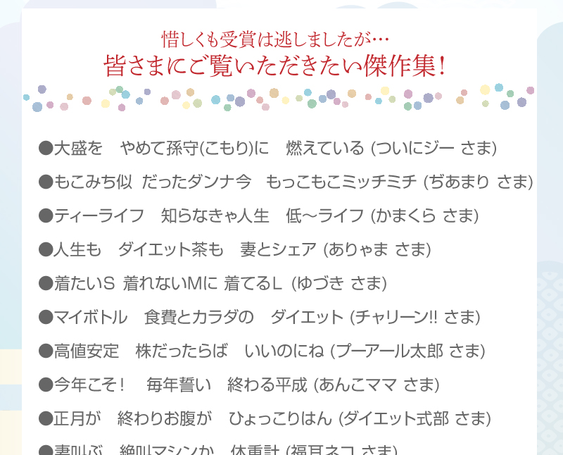 最優秀賞 優秀賞 特別賞 惜しくも受賞は逃しましたが・・・皆さまにご覧いただきたい傑作集! 期間中、2582句ものダイエット川柳をお寄せいただきました。 たくさんのご応募、誠にありがとうございました!