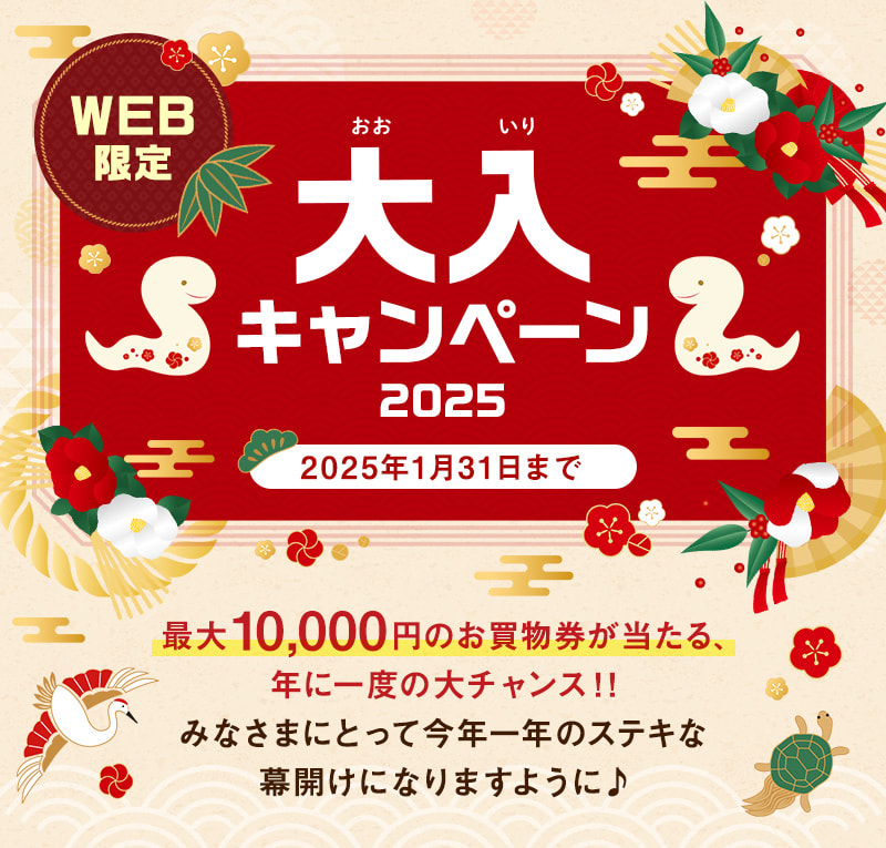 2025年1月6日(月)~1月31日(金)までの期間中、WEBサイトまたはアプリから、1回のお申込金額の合計が10,000円(税込・割引前・送料除く)以上で、ご応募されたお客様の中から抽選で合計70名様にプレゼントいたします。