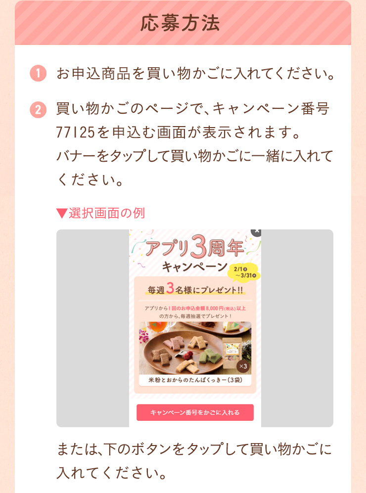 2/1〜3/31 毎週3名様にプレゼント!! 2/1〜3/31 毎週3名様にプレゼント!! 下記の対象期間中、ティーライフ公式アプリから1回のお申込金額の合計が8,000円(税込・割引前・送料除く)以上で、ご応募いただいたお客様の中から抽選で毎週3名様にプレゼントいたします。 応募方法 1:お申込商品を買い物かごに入れてください。 2:買い物かごのページで、キャンペーン番号77125を申込む画面が表示されます。バナーをタップして買い物かごに一緒に入れてください。 キャンペーン番号77125を買い物カゴに入れる 3:お申込手続きへお進みいただき、お申込みを確定しましたらご応募完了となります。