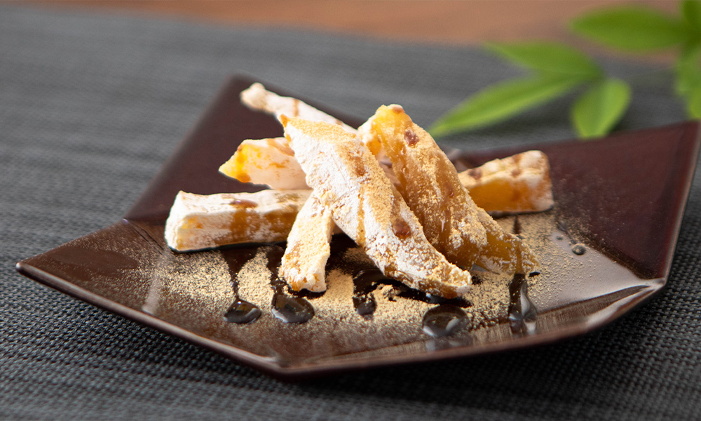 干し芋に、きなこと黒みつをかけるだけの簡単アレンジ。生産者さん大絶賛のアレンジ方法です。